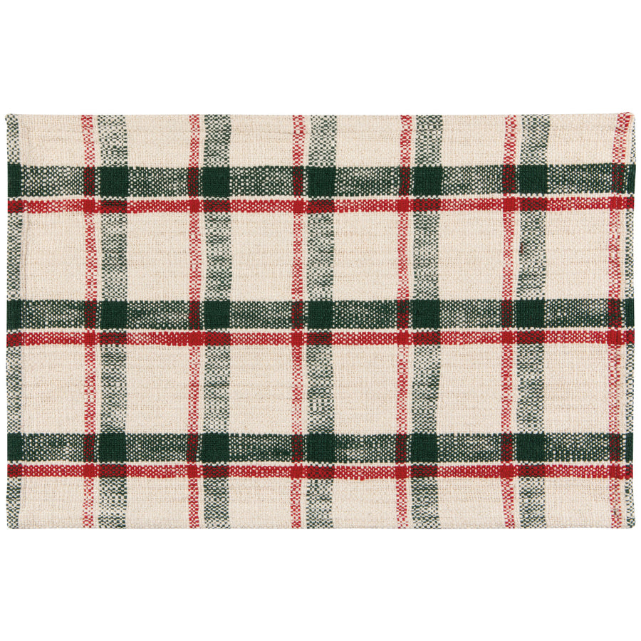 This set of four placemats features a textured neutral base complemented by classic red and green plaid, perfect for adding a warm, festive touch to your table.