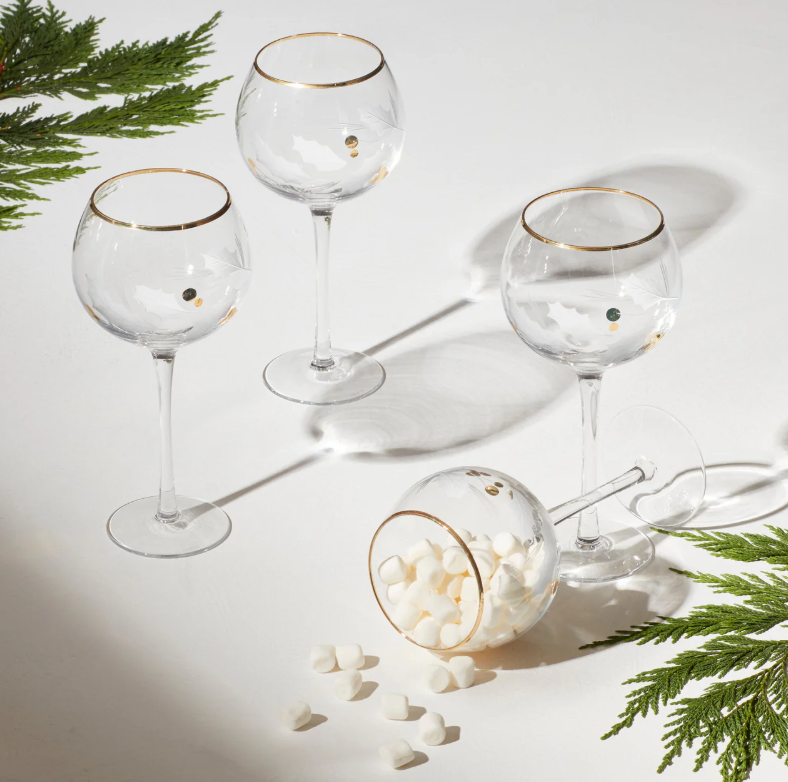 Etched holly leaves with golden berries form an elegant holiday pattern on this wine glass. The balloon shape is great for red wine to let it breath. A delicate gold finish creates a polished design around the rim.