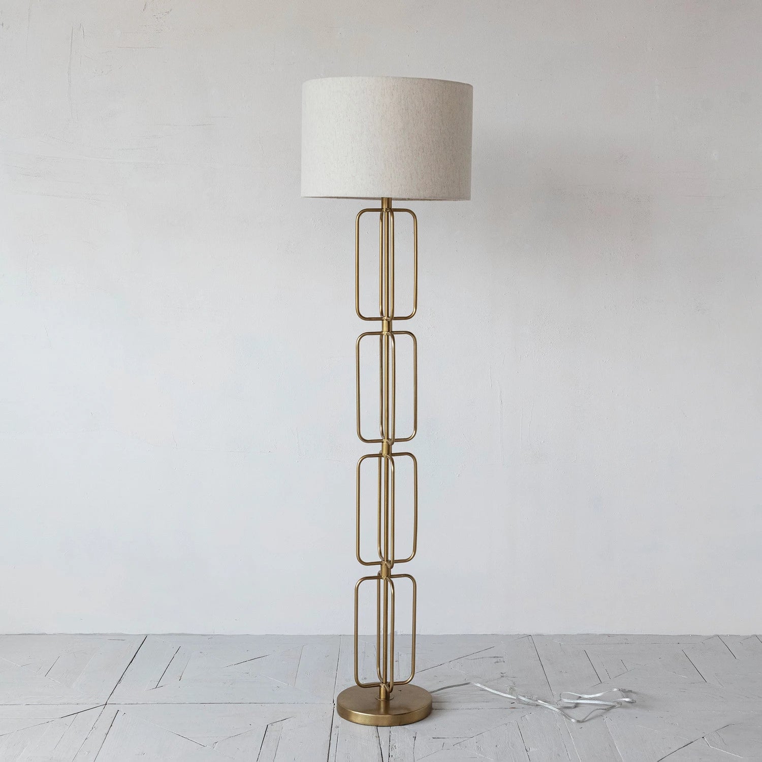 Description: 18" Round x 66"H Metal Wire Floor Lamp w/ Cotton Shade & Inline Switch, Gold Finish