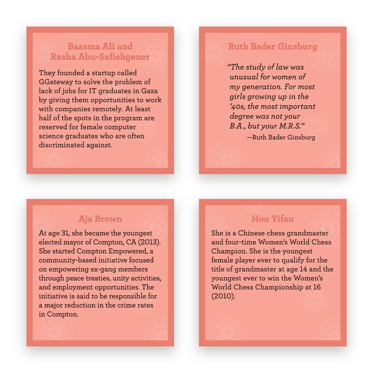 2021 Academics’ Choice Award™ Winner for mind-building product excellence The 125 women and girls profiled are astronauts and adventurers, athletes, writers, directors, doctors, and scientists; the courageous and curious, from nearly every continent on the planet, from the past and present. We’ve combined questions girls will love to talk about with stories and quotes from some pretty amazing role models that are sure to fuel meaningful conversations. Be inspired by Anne Frank, Cori “Coco” Gauff, Coretta Scott King, Eleanor Roosevelt, Emily Dickinson, Georgia O’Keeffe, Greta Thunberg, Liz Wallace & Mallory Holtzman, Jane Goodall, Jackie Joyner-Kersee, Mae Jemison, Malala Yousafzai, Ruth Bader Ginsburg, Tracy Chou, Taylor Swift, and many more.