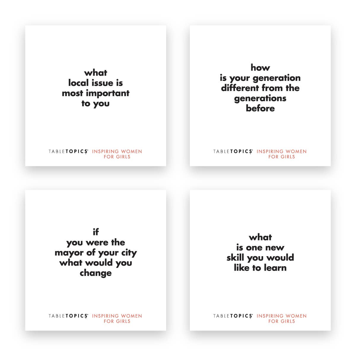 135 question cards in a 4" x 4" x 4" clear, acrylic cube. Ages 8 and up