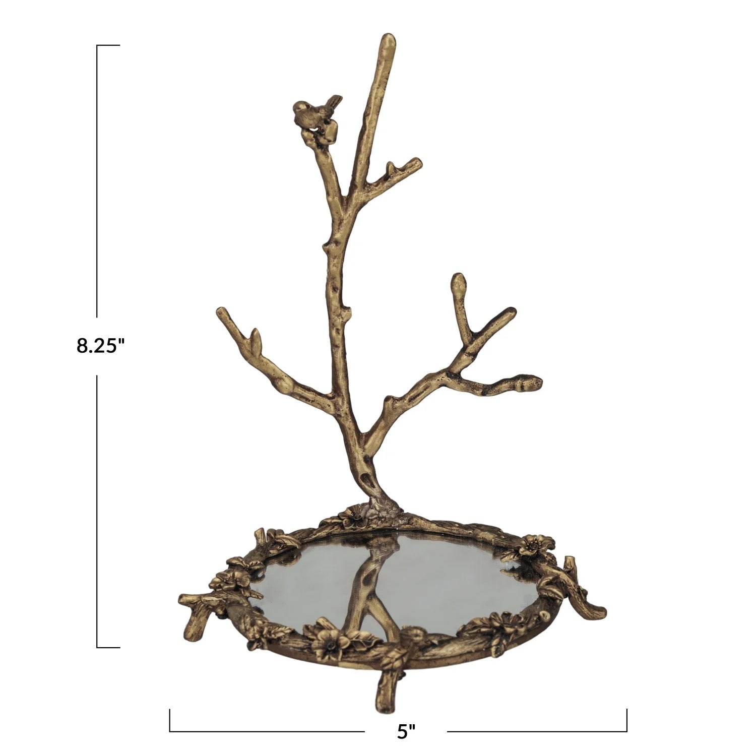 This Pewter Jewelry Holder is a delightful blend of functionality and decorative art. The antique gold finish gives it a timeless look, while the mirrored base adds practicality and style. Perched atop the holder, the bird on a branch evokes a sense of nature and serenity. Measuring 5"D x 8.25"H, it's a perfect size for displaying and organizing jewelry. Whether used to keep jewelry pieces within reach or simply as a decorative piece, this jewelry holder is a lovely addition to any space that appreciates the rustic and romantic flair of garden or farmhouse aesthetics.