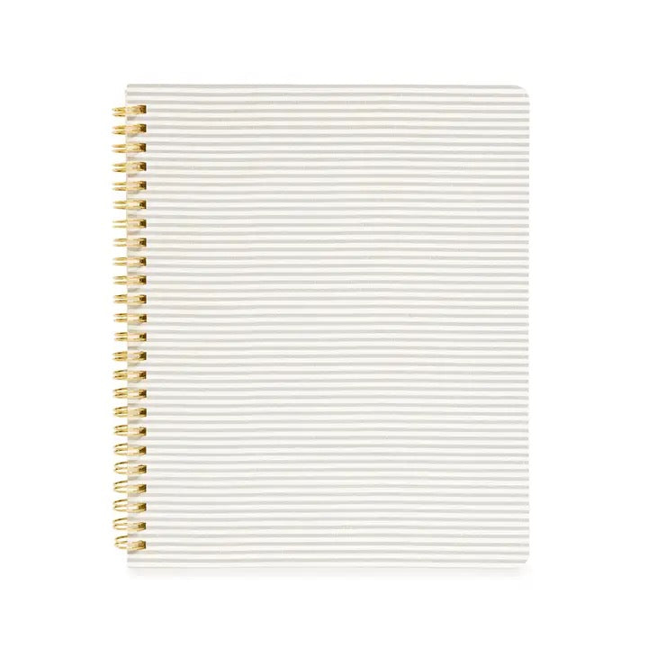 Our Spiral Notebook in grey and white stripe is spiral bound with 50 lined pages.