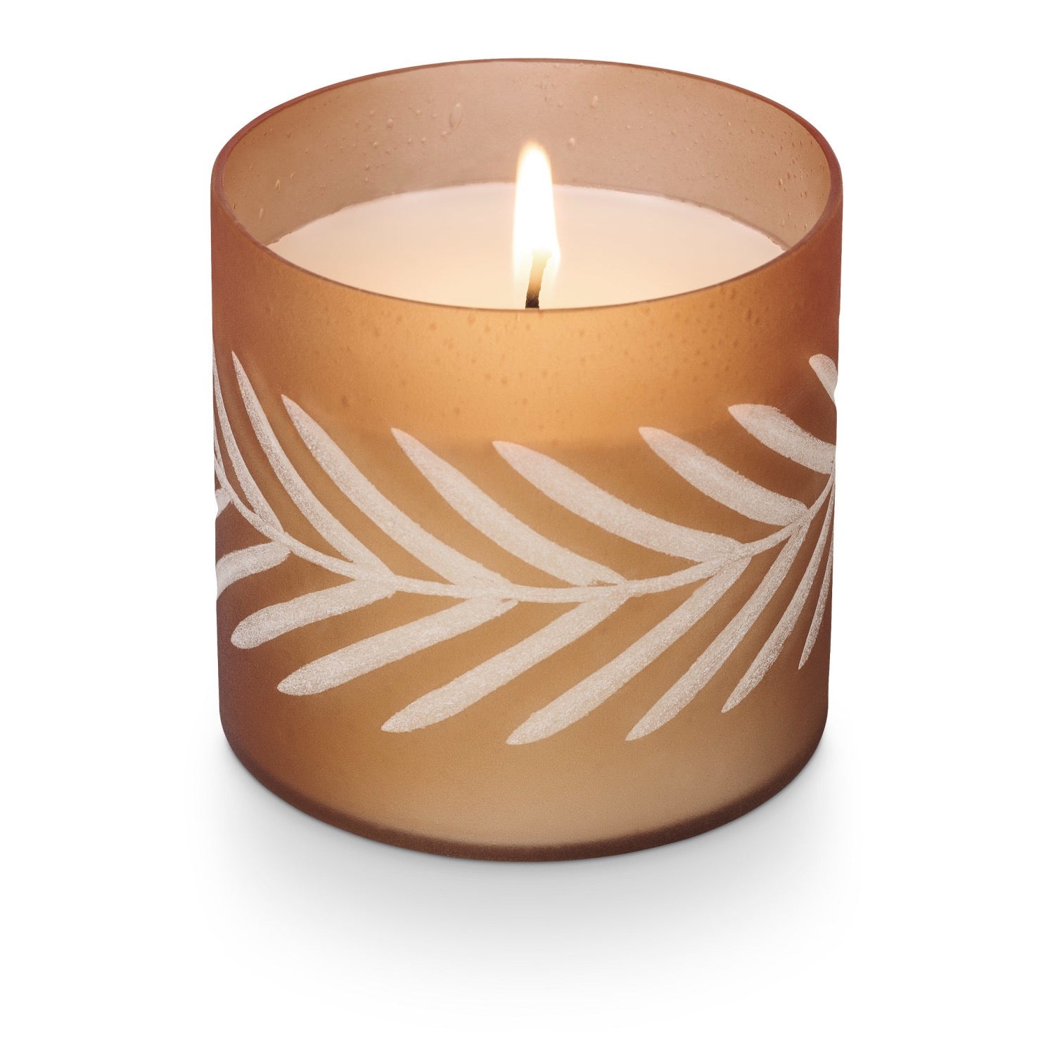 Complement nature's stunning show with fragrances that inspire cozy sweaters and crunchy leaf walks. A soft frost exterior pairs with a bold leaf deco print on this mercury glass candle. Plant-based soy blend candle poured in the USA. Burns up to 30 hours; 1 wick. This scent showcases notes of roasted chestnuts, cinnamon, and coconut create the quintessential fragrance of fall.