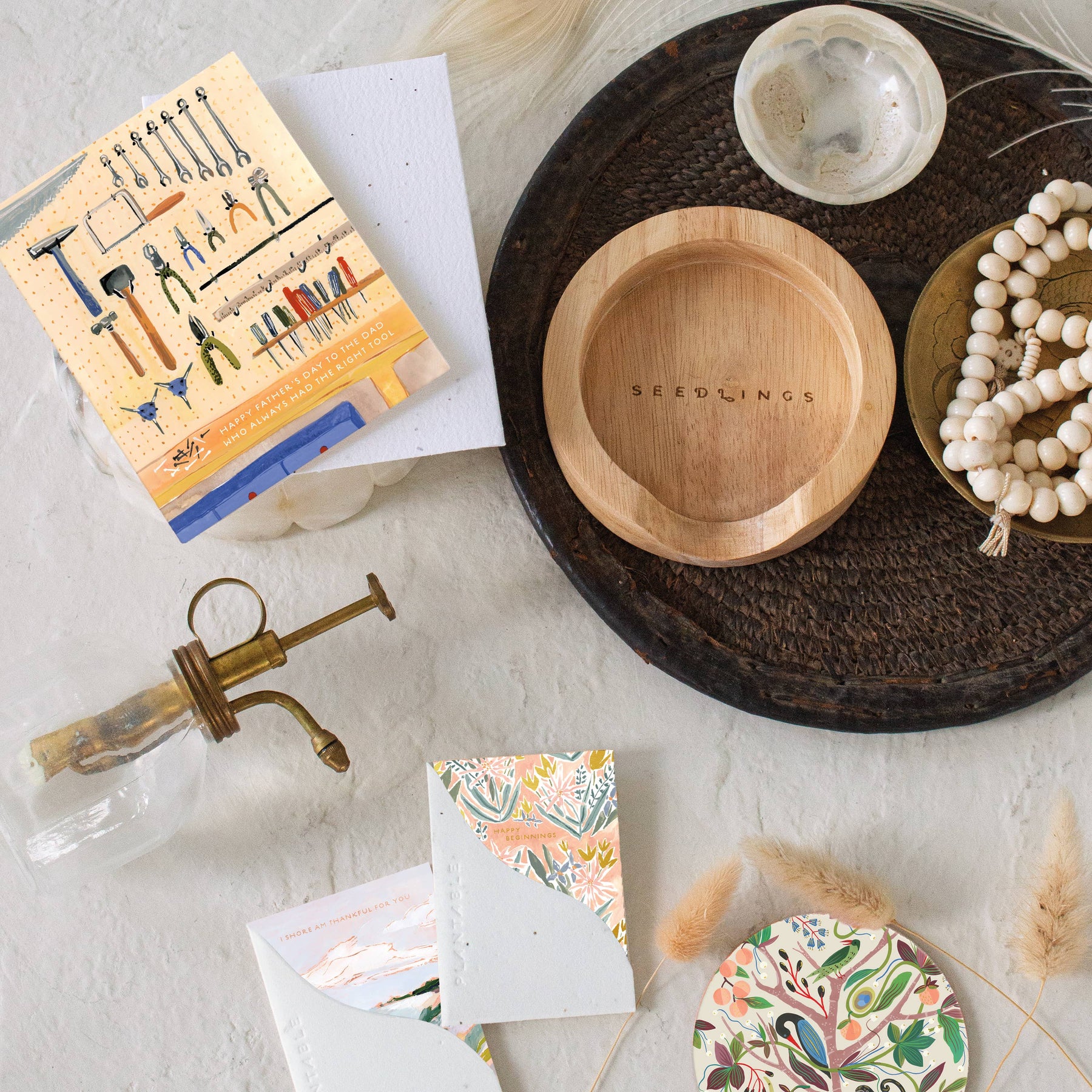 All Seedlings greeting cards have foil details and a PLANTABLE seed paper envelope which is embedded with wildflower seeds. This seed paper is made of a biodegradable eco-paper created with post-consumer materials - no trees harmed for this paper! When planted, the envelope will compost away leaving only flowers behind. Blank inside, cards are printed on premium paper and are all accented with foil details.