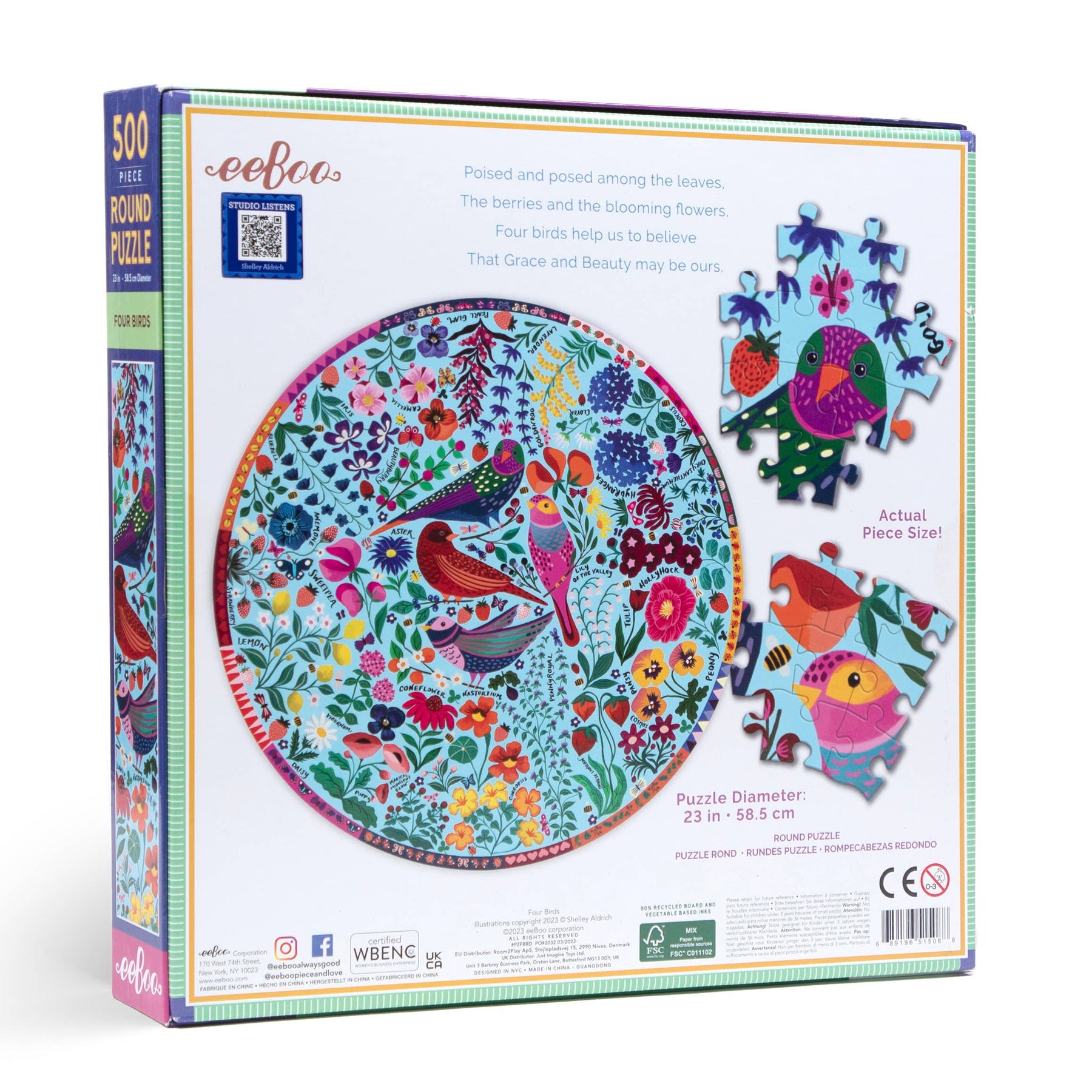 Four Birds is a 500 piece round jigsaw puzzle. Beautiful, original artwork by Shelley Aldrich. Four delicately rendered birds are surrounded by a garden of heritage flowers that are evocative of an English garden.