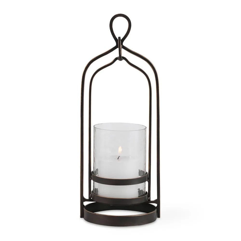 Taking Cues From Moroccan Style, This Candleholder Is Finished In Dark Bronze With Gold Rub-through Details And A Textured Glass Hurricane. One White 3"x 3" Candle Is Included.